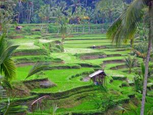 From the far northwest of Bali, it's a short drive to Ubud. Upon arrival, you see the green rice terraces all around you where ducks balance on the edges of the rice paddies. Ubud is the green, artistic heart of Bali. In the village, you will find small shops where painters are working and selling their work. Nearby, sculptors are making Buddha statues and carvers are carving to make masks. During the day, you can visit temples in the area where Balinese women bring daily rice offerings.